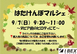はたけんぼマルシェ開催について event 2025.08.29 いつもご利用いただきありがとうございます。 下記の予定にてイベントを開催いたします。 イベント:はたけんぼマルシェ 日 時:9月7日(日) 9:30~11:00 場 所:ヌビア前ピロティ 会員様以外の方でもご利用いただけますので、是非お越しください。 マイバック持参にご協力下さい。 購入後の商品については、自己管理をお願い致します。
