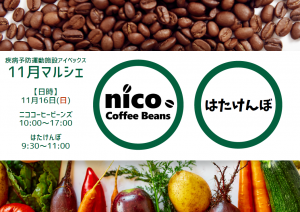 はたけんぼマルシェ開催について event 2025.11.04 いつもご利用いただきありがとうございます。 下記の予定にてイベントを開催いたします。 ニココーヒービーンズ 日 時:11月16日(日) 10:00~17:00 場 所:アイベックス入り口前 はたけんぼマルシェ 日 時:11月16日(日) 9:30~11:00 場 所:ヌビア前ピロティ 会員様以外の方でもご利用いただけますので、是非お越しください。 マイバック持参にご協力下さい。 購入後の商品については、自己管理をお願い致します。