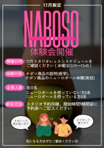 ナボソ体験会のお知らせ event 2025.12.02 以下の日程でナボソの体験会を開催いたします。 3日(水) 13:15~13:45 8日(月) 11:00~11:30 12日(金) 19:00~19:30 16日(火) 19:15~19:45 17日(水) 13:15~13:45 22日(月) 11:00~11:30 詳しくはスタッフまでお尋ねください。 皆様のご参加お待ちしております。