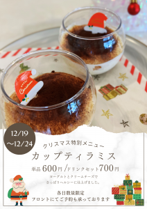 ヌビアからのお知らせ event 2025.12.16 12月19日(金)~24日(水) 新メニューカップティラミスを提供します。 クリスマス限定メニューとなります。 数量限定ですので、興味がある方はフロントにてご予約お待ちしております。
