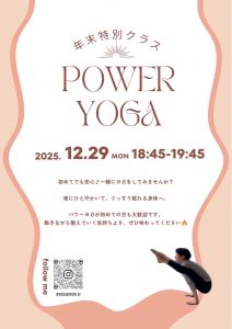 スタジオについてのお知らせ event 2025.12.16 12月29日(月) 18:45~19:45 年末特別スタジオ「POWER YOGA」が行われます。 スタジオ1時間前の予約になります。 初めての方も是非ご参加ください。