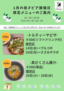 ヌビアからのお知らせ event 2026.01.11 いつもご利用ありがとうございます。 1月は上記の内容で補食提供を行います。 今月も限定メニューを各種ご用意しております。 運動前後のエネルギー補給にいかがでしょうか? 事前予約も承ります。ご利用の際はフロントの方にお越しください。 皆様のご来館お待ちしております。