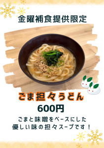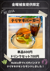 ヌビアから金曜日メニューのお知らせ event 2026.01.16 ヌビア金曜営業日に「テリヤキバーガー」と「ごま坦々うどん」を隔週で提供致します。 こちら数量限定メニューとなります。ご予約はフロントにて承ります。 ※提供時間 どちらも11:30~14:00まで 詳しくはスタッフにお尋ねください。皆様のご利用お待ちしています。