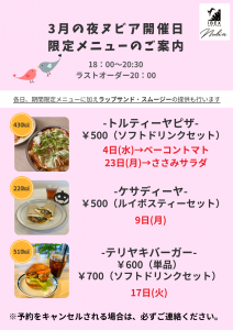 夜ヌビア営業日のお知らせ event 2026.03.01 いつもご利用ありがとうございます。 3月は上記の内容で補食提供を行います。 今月も限定メニューを各種ご用意しております。 運動前後のエネルギー補給にいかがでしょうか? 事前予約も承ります。ご利用の際はフロントの方にお越しください。 皆様のご来館お待ちしております。