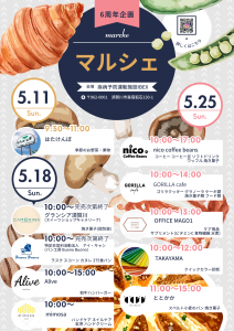 6周年企画 マルシェ event 2025.05.09 6周年企画で今年もいろいろなお店がアイベックスへやってきます! 総出店数10店舗と多くのお店にご協力いただきました。 会員外のお客様もマルシェをご利用いただけます。 ※11日、18日、25日と日程によって出店数が異なります。