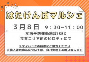 はたけんぼマルシェについて event 2026.03.01 いつもご利用いただきありがとうございます。 下記の予定にてイベントを開催いたします。 イベント:はたけんぼマルシェ 日 時:3月8日(日) 9:30~11:00 場 所:ヌビア前ピロティ 旬のお野菜や、果物がそろっています。 会員様以外の方でもご利用いただけますので、是非お越しください。 マイバック持参にご協力下さい。 購入後の商品については、自己管理をお願い致します。