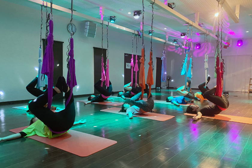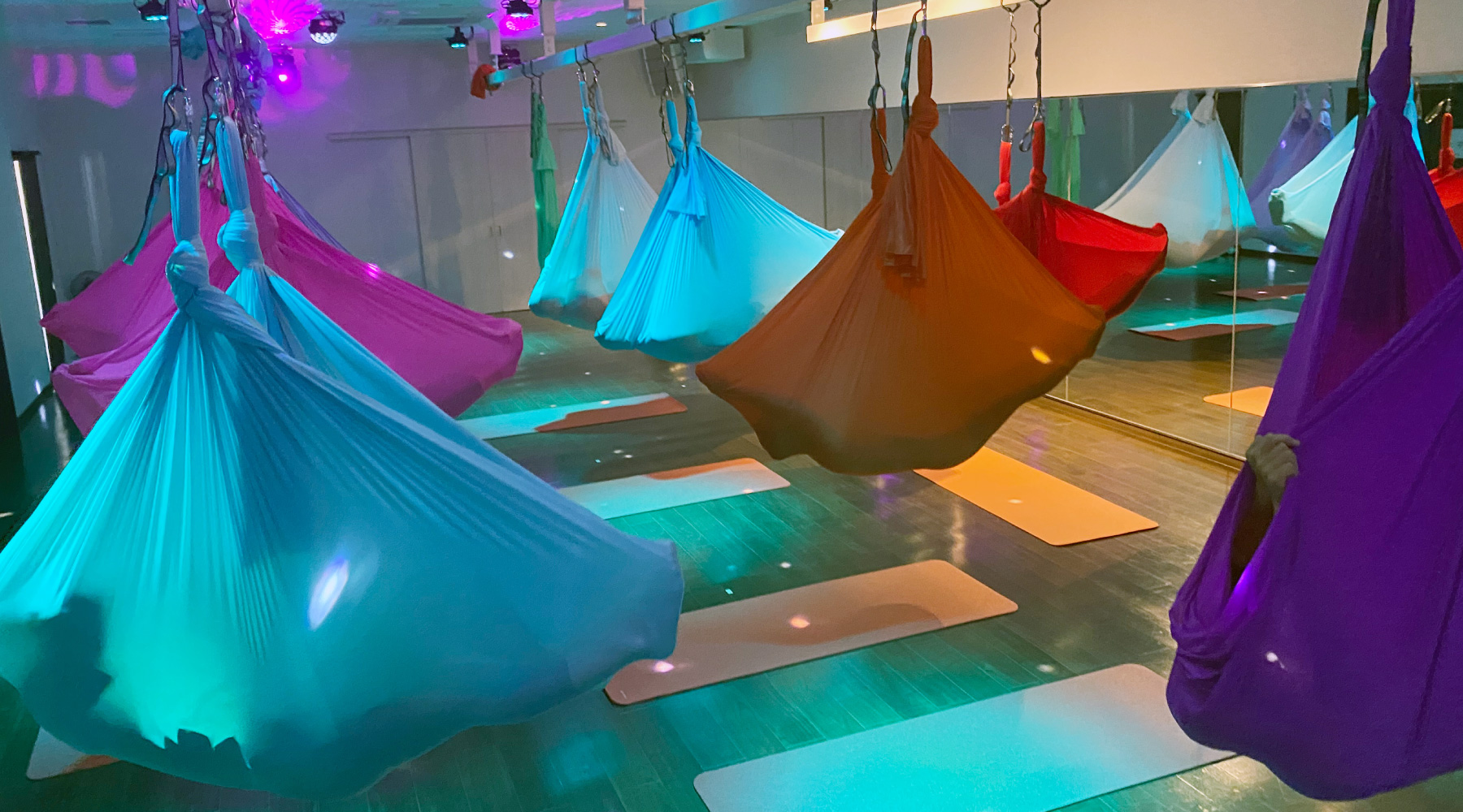 ハンモックに慣れてきた⽅限定。布に⽴ち上がったり、逆さまになる動作がメインです。バランス感覚の向上、コアを中⼼に全⾝の筋⼒強化、冷えや浮腫みの改善を図ります。 ⾮⽇常体験したい⽅、挑戦したい⽅におすすめです。