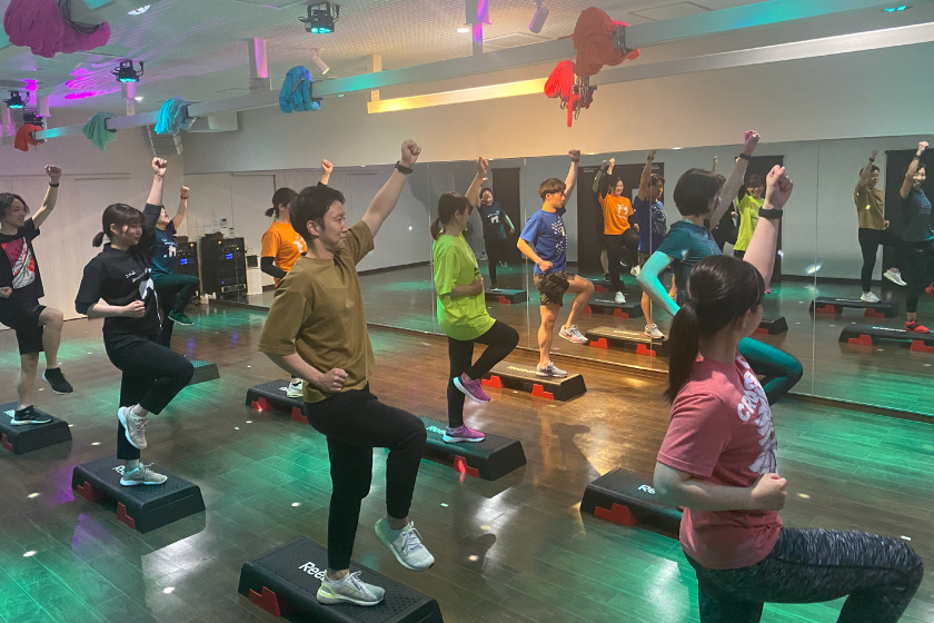 ステップエクササイズ音のリズムに合わせてステップ台への昇降運動を繰り返します。足腰の強化、体脂肪燃焼を目的とします。振付がシンプルなので男性も参加しやすいプログラムです。